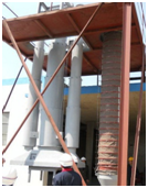 當(dāng)運(yùn)輸工具進(jìn)入位置后,打開(kāi)棒閥相應(yīng)的棒條數(shù)量。按住控制柜的“下降鈕”,下料頭到位后會(huì)自動(dòng)斷開(kāi)升降電機(jī)電源,按“裝車(chē)鈕”進(jìn)入御料狀態(tài),輔助配套設(shè)備會(huì)相應(yīng)開(kāi)始工作,卸料產(chǎn)生的灰塵通過(guò)進(jìn)料斗,由伸縮收塵軟管進(jìn)入收塵器凈化,當(dāng)下料頭的物料裝滿時(shí),下料頭邊上升,邊報(bào)警,上升距離要在裝料前設(shè)置。若上升距1米,則將時(shí)間繼電器的時(shí)間調(diào)為T(mén)=1/V。在上升過(guò)程中裝料始終在進(jìn)行,當(dāng)下料頭滿時(shí),再重復(fù)上述動(dòng)作,到達(dá)料滿位置后,按停車(chē)鈕,使電振機(jī)反制動(dòng),或關(guān)閉扇形閥下料停止工作,其它設(shè)備相應(yīng)停止工作。停車(chē)后可按上升按鈕讓下料斗離開(kāi)物料一定距離,確保運(yùn)輸工具的移動(dòng),再對(duì)準(zhǔn)第二個(gè)卸料工位。直到整個(gè)料倉(cāng)裝滿為止。